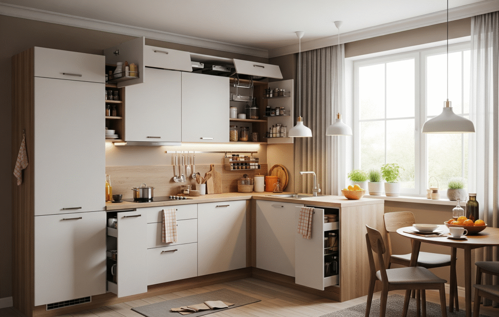 - स्टोरेज: पुल-आउट्स और कॉर्नर यूनिट्स जैसी स्मार्ट स्टोरेज यूनिट्स चुनें ताकि कोई जगह बेकार न जाए।